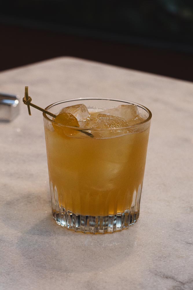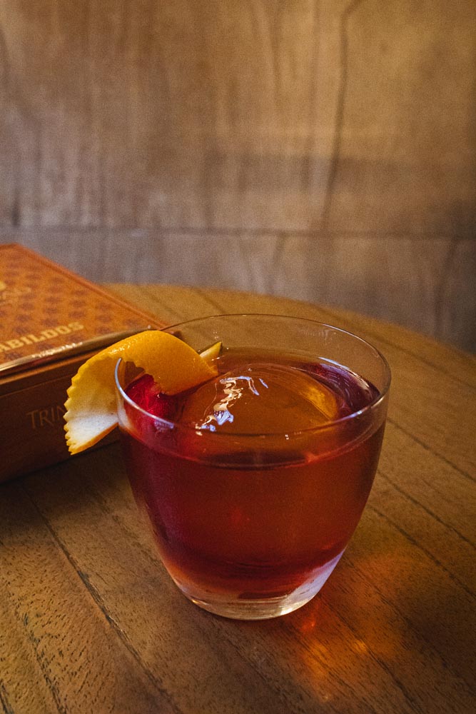 Bourbon Whisky, xarope simples, blend de bitters, perfume de laranja e Amarena