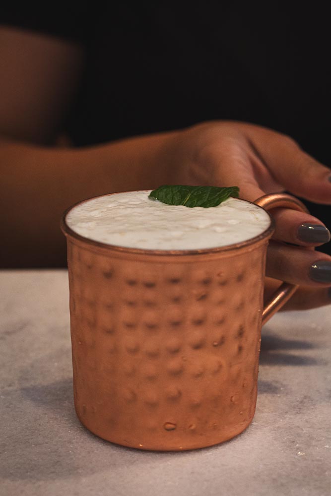 Vodka Absolut, xarope artesanal de gengibre, limão, Angostura bitter e espuma cremosa de gengibre